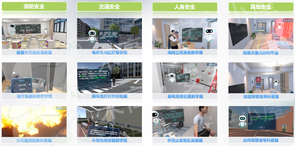 以“未高·安全小屋”时空AI安全教育平台作为实施载体,结合中小学生的认知特点和安全需要,从校园、家庭、交通安全等与学生息息相关的应急消防知识,以及安全技能入手,