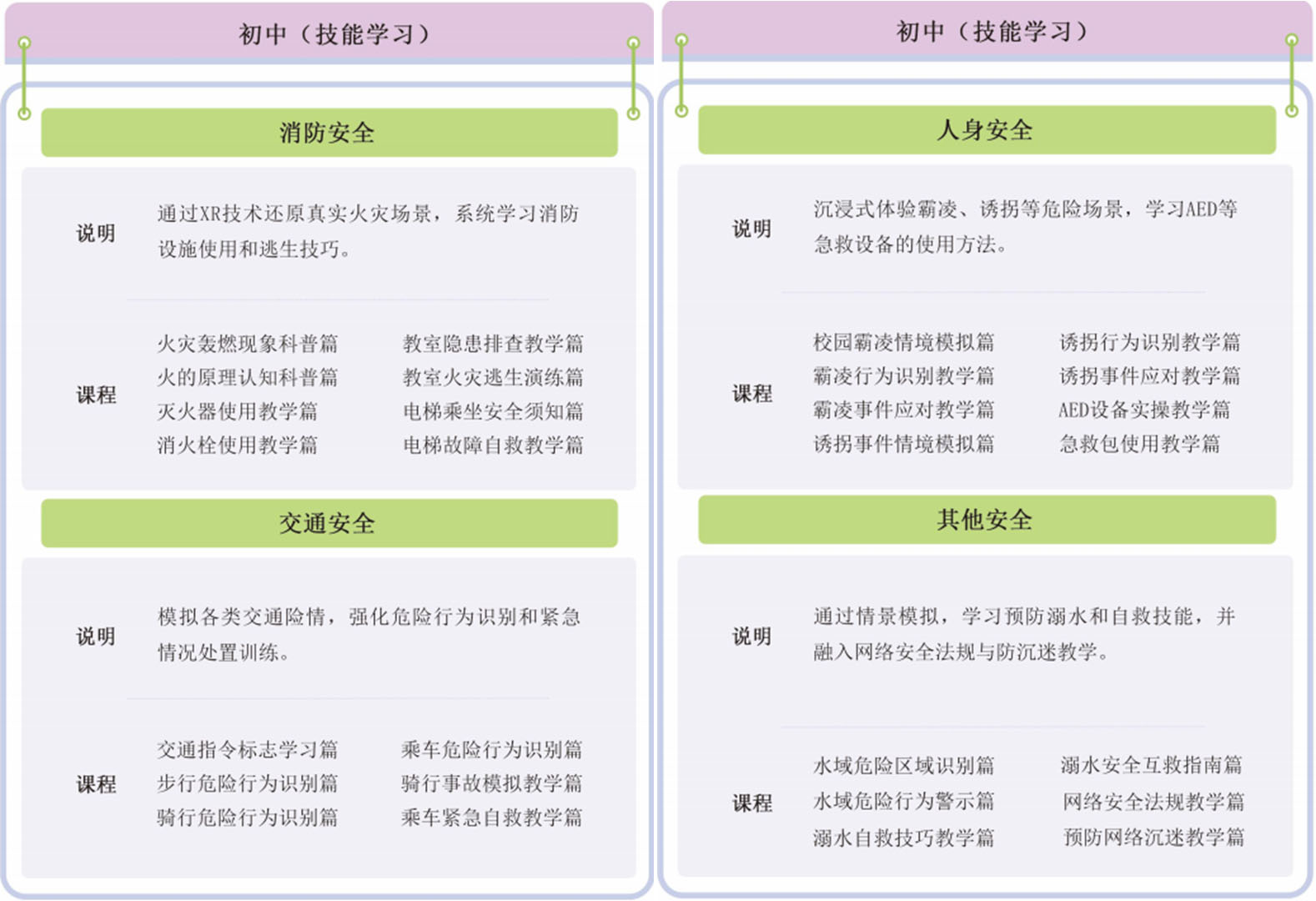 侧重安全技能习得,通过VR情景演练与实物操作相结合的模式,提高学生公共安全认知水平。