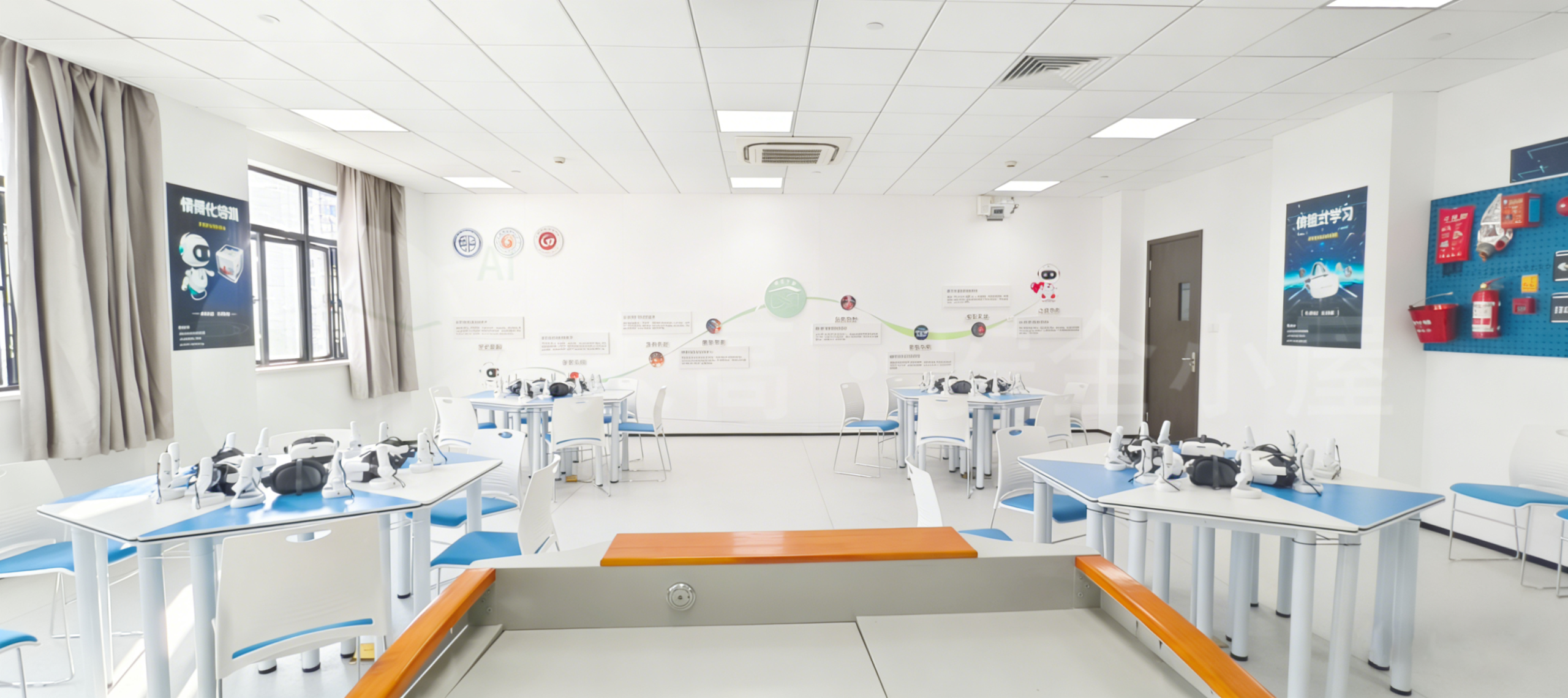 融合智能硬件与实物教具,配备千兆网络,支持20人同时培训。 配备AI+XR专用学习机、智能急救训练马甲、心肺复苏模拟人、急救包等专业安全教具, 为学生提供一个虚实融合的安全实训场所,打造一个让安全意识生根发芽的成长基地。