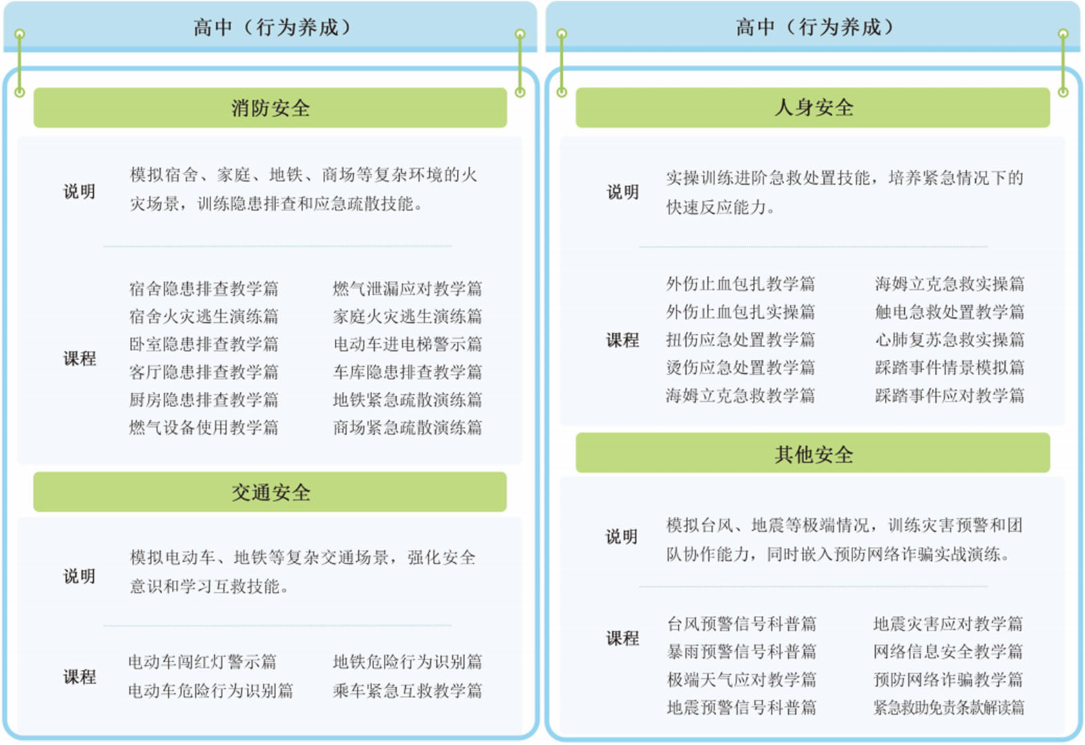 小学、初中、高中各设置16课时的安全教育实训课程。